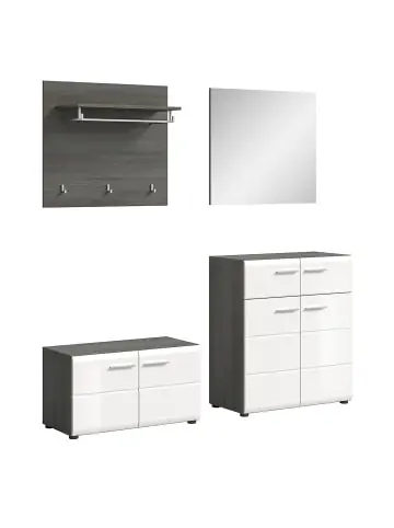 Salsa Flurmöbel-Set weiß Hochglanz. Lose Regale: 6. Das Salsa-Dielenmöbelset in Hochglanzweiß ist die perfekte Lösung für moderne Aufbewahrung und einen organisierten Eingangsbereich. Das Set besteht aus einer Garderobe mit drei Haken, einem Spiegel, einer Schublade und Schrankmodulen, die mehrere Regale aufnehmen. Mit den sechs herausnehmbaren Einlegeböden erhalten Sie die Flexibilität, den Stauraum je nach Bedarf anzupassen. Der kombinierte Einsatz von Hochglanz und dunklem Holzfinish sorgt für ein stilvolles und dennoch funktionales Design. Das Eingangsmöbelset ist ideal, um Ihre Sachen organisiert zu halten und verleiht Ihrem Eingangsbereich ein schlichtes und modernes Aussehen.