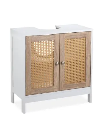 Mit dem praktischen Unterstellschrank nutzt Du den freien Platz unter Deinem Waschbecken optimal aus. Vor allem in kleinen Bädern kannst Du so zusätzlichen unverzichtbaren Stauraum schaffen. Der in 2 Fächer einteilbare Innenraum des Badschranks bietet ausreichend Platz für Handtücher, Toilettenpapier, Putzmittel und andere Badutensilien. Die Türen im Rattan-Design verleihen dem weißen Waschtischschrank einen ansprechenden Look, der in jedem Badezimmer dekorative Akzente setzt.Waschbeckenunterschrank im Detail- Maße H x B x T: ca. 61,5 x 60 x 30 cm- Siphonaussparung H x B x T ca. 25,5 x 19,5 x 17,5 cm- Max. Traglast: 30 kg- Gewicht: ca. 9 kg- Material: MDF, Faserplatte, PE – Farbe: Weiß, NaturWaschbeckenschrank mit in 3 Höhen platzierbarem Einlegeboden- Fächerhöhe bei unterer Stufe: ca. 28 cm / 16,5 cm- Fächerhöhe bei mittlerer Stufe: ca. 22 cm / 23 cm- Fächerhöhe bei oberer Stufen: ca. 15,5 cm / 29,5 cmWeißer Badunterschrank mit Rattan-Türen – Schafft zusätzlichen Stauraum im Badezimmer – Bietet Platz für Handtücher, Toilettenpapier, Putzmittel etc. – Mit Siphon-Aussparung für gängige Waschbecken – Fächerhöhe dank flexiblem Einlegeboden individuell festlegen – Dekorative Kombination aus weißem Korpus und Türen mit Wiener Geflecht – Passt wunderbar zu Badeinrichtungen im angesagten Boho-Stil Lieferumfang- 1x Waschtischunterschrank in Einzelteilen – Anleitung und Montagematerial- Dekoartikel sind im Lieferumfang nicht enthalten