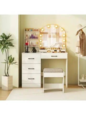 Beschreibung: Verbessern Sie Ihre tägliche Schönheitsroutine mit unserem Frisiertisch! Mit 2 AC-Steckdosen, 1 USB-Anschluss und 1 Typ-C-Anschluss können Sie Ihre Geräte bequem mit Strom versorgen, während Sie sich fertig machen. Der LED-beleuchtete Spiegel bietet einstellbare Helligkeit und 3-farbige Beleuchtungsoptionen. Gleichzeitig wird ihr Zimmer aufgrund reichlich Stauraum, einschließlich offener Regale und Schubladen, ordentlich gehalten. Mit seinem modernen Design und den durchdachten Funktionen ist dieser Schminktisch ein stilvolles und praktisches Geschenk für Ihre Lieben.Eigenschaften: Enthält einen passenden Hocker mit gepolstertem Sitzkissen Ausgestattet mit einem 3-farbigen LED-beleuchteten Spiegel Integrierte Ladestation mit 2 AC-Steckdosen, einem USB-Anschluss und einem Typ-C-Anschluss Bietet eine kabellose Ladefunktion für Mobiltelefone Großzügiger Stauraum mit Schubladen, Regalen und einem Schreibtisch-Organizer Verwendet Schubladenführungen aus Metall für zuverlässige Haltbarkeit Mit praktischen Schubladengriffen gefertigt Material: Holzwerkstoff, MDF, Glas Tischmaße: 100 x 40 x 140 cm (L x B x H) Hockermaße: 40 x 30 x 46 cm (L x B x H) Spiegelmaße: 60,5 x 52 cm Tragfähigkeit der Tischplatte: 50 kg Tragfähigkeit des Hockers: 150 kg AC-Steckdose: 250 V/16 A USB-Anschluss: 5 V/3,0 A Typ-C-Anschluss: 5 V/3,0 A Länge des Netzkabels: 1,5 m Nettogewicht: 42,5 kgLieferungsumfang: 1 x Schminktisch 1 x Hocker 1 x HandbuchAchtung! Die Lieferung umfasst 2 Pakete, die nicht notwendigerweise mit demselben Spediteur verschickt werden und nicht unbedingt zur gleichen Zeit ankommen.