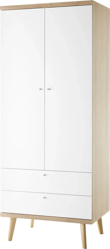 Der Kleiderschrank ist in der Farbe Weiß mit Eiche Riviera Nachbildung erhältlich und aus FSC®-zertifizierten Holzwerkstoff gefertigt.. Das moderne skandinavische Design sorgt für ein besonderes Wohnerlebnis und harmoniert mit den restlichen Möbeln des Programms Merle perfekt.. Die Kleiderstange sowie die 2 großen Schubladen bieten ausreichend Stauraum und sorgen dafür, dass du deine Kleidung optimal verstauen kannst.. Die silbernen Metallgriffe und die Massivholzfüße runden die Optik des Schrankes wunderbar ab.. Maße (B/T/H) 80/56/197 cm