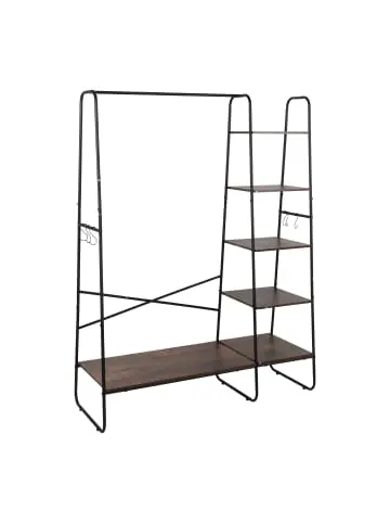 Diese offene Flurgarderobe schafft Stauraum in Flur, Gäste- oder Schlafzimmer. Hänge Deine Jacken, Mäntel, Blusen und andere Kleidungsstücke übersichtlich an der Garderobe auf. Auf den Regalebenen des freistehenden Kleiderständers lassen sich Aufbewahrungsboxen, Taschen oder Accessoires verstauen. Auch Deine Schuhe hast Du auf der breiten Ablagefläche immer griffbereit. Das Design aus Metall und Holzoptik fügt sich gut in einen modernen Wohnstil ein.Kleiderständer im Detail – Maße H x B x T: ca. 160 x 120 x 45 cm – Traglast Kleiderstange: ca. 25 kg – Traglast je Regalboden: ca. 5 kg – Traglast Schuhablage: ca. 40 kg – Gewicht: ca. 12,7 kg – Material: Eisen, MDF – Farbe: Braun, SchwarzKleidergarderobe mit viel Stauraum – Kleiderstange LxD: ca. 77 x 1,5 cm – Abstand zw. Stange und Ablage: ca. 135 cm – Untere Ablage BxT: ca. 76,5 x 42,5 cm – Regalbretter Breite: je ca. 38 cm – Regalbretter Tiefe: ca. 24/ 29/ 33,5/ 38/ 42 cm – Regalbretter Abstand (oben nach unten): ca. 29/ 32/ 27/ 27 cmGarderobenständer mit Ablagen – Zum Aufhängen von Jacken, Hemden, Blusen, uvm. – Mit 6 S-Haken für Handtaschen, Rucksäcke uvm. – 6 geräumige Ablagen für Ordnungsboxen oder Schuhe – Hausschuhe sind auf der unteren Ebene griffbereit – Stabiles Garderobengestell in A-Form mit verstellbaren Füßen – Offenes Design für einen guten Überblick und schnellen Zugriff – Industrial Design mit Metallrahmen und Ebenen in HolzoptikLieferumfang – 1x Kleiderständer – 6x S-Haken – Mit Anleitung – Mit Montagmaterial – Dekoartikel sind nicht im Lieferumfang enthalten