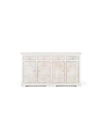 Dieses prächtige Sideboard aus massivem Mangoholz mit gealterter weißer Oberfläche bietet mit seinen 4 Türen und 4 fein handgeschnitzten Schubladen einen handwerklichen Charakter. Im Inneren sorgen raffiniert angeordnete Regale für funktionellen Raum. Mit einer Höhe von 100 cm, einer Länge von 180 cm und einer Breite von 40 cm wird dieses 80 kg schwere Möbelstück gebrauchsfertig in einer Verpackung von 105 x 185 x 45 cm geliefert, ohne dass eine Montage erforderlich ist. Wood