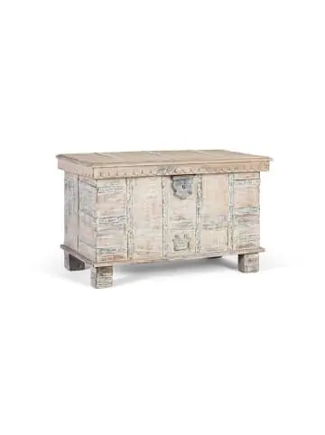 Massivholztruhe mit Öffnung oben und weißem Antik-Finish. Mit dekorativen Metallverstärkungen und einem dekorativen Schloss an der Vorderseite. Das rustikale, Antik-Design macht sie ideal zur Aufbewahrung und Dekoration in Räumen im Vintage- oder Kolonialstil. INNENMAßE: 40 x 76 x 37 cm, FUSSHÖHE: 9 cm, DECKEL: 9 cm Wood