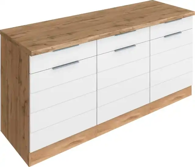 Hochwertige MDF-Fronten mit waagerechter Lisene. Elegante Metall-Griffleiste. Höhenverstellbare Möbelfüße. Maße B/T/H ca.: 180/60/86 cm. Made in Germany