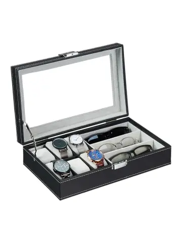 Mit diesem Schmuck-Organizer bewahrst Du Deine liebsten Schmuckstücke geordnet und übersichtlich auf. Die großen Fächer bieten Dir ausreichend Stauraum für Brillen, lange Halsketten, Armbänder oder Ohrringe – auch Deine Uhren finden auf einem der 6 Uhrenkissen ihren Platz. Der weiche Bezug der Schmuckbox bietet dabei Schutz vor Kratzern. Mit dem Sichtfenster und dem eleganten Design in Lederoptik wird der Schmuckbehälter zu einem tollen Hingucker auf Deinem Schmink- und Frisiertisch.Brillen- und Uhrenbox im Detail – Maße H x B x T: ca. 9 x 33 x 20,5 cm – 6 Uhrenkissen H x B x T: ca. 3,5 x 4,5 x 7 cm – 3 Fächer H x B x T: ca. 4 x 16 x 5,5 cm – Gewicht: ca. 1,1 kg – Material: MDF, Kunststoff, Baumwolle – In verschiedenen FarbenEdles Schmuckkästchen zum Verschließen – Uhrenkissen zur sicheren Aufbewahrung von bis zu 6 Uhren – Schmuckdose mit großen Fächern für Brillen, Halsketten, uvm. – Modernes Design in Lederoptik mit praktischem Sichtfenster – Weicher Innenbezug schützt Schmuckstücke vor Kratzern – Staubgeschützte Aufbewahrung dank Deckel mit VerschlussLieferumfang – 1x Schmuckaufbewahrung – Dekoartikel sind nicht im Lieferumfang enthalten
