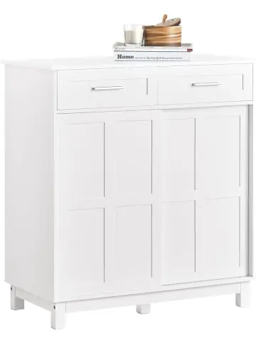 Möchten Sie mehr von der linken oder rechten Schrankseite zeigen? Durch die flexiblen Schiebetüren können Sie Ihre Meinung jederzeit ändern. In den 2 Schubladen können Sie Ihre Geldbörse, Regenschirme, Schuhpolitur usw. unterbringen. Fünf Beine machen dem Schuhschrank stabiler. Inklusive Bodenschoner um Schäden und Kratzer zu verhindern.Gewicht: ca.25kg; Belastbarkeit: bis 75kg (Obere Platte 20 kg, Einlegeboden hinter den Türen 15 kg, Bodenplatte 20 kg, jede Schublade 10 kg); Material:MDF(E1).