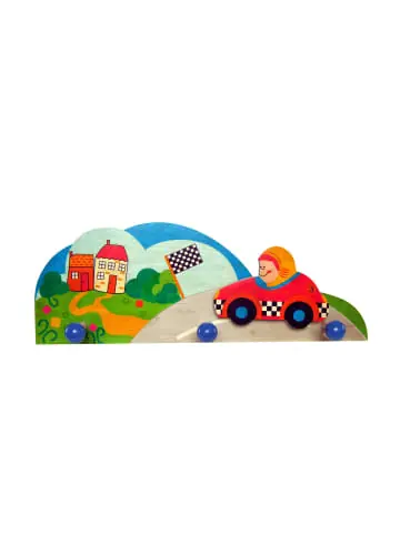 Die bunte Garderobe aus Holz ist ein absoluter Blickfang in jedem Kinderzimmer oder Flur. Die lustigen Motive und die farbenfrohe Gestaltung sorgen für eine freundliche Atmosphäre und gute Laune.Die 3 Kleiderhaken bieten viel Platz für Jacken, Pullover und alles was aufgehängt werden kann. Die liebevolle Gestaltung und das kindliche Design sorgt beim Anziehen für ein Lächeln. Wird sie in einer niedrigen Höhe aufgehängt, können die Kleinen sich schon bald ganz alleine ankleiden. •Garderobe mit 3 Kleiderhaken •sorgt für Selbstständigkeit •Breite ca. 37 cm Achtung: Dekoration, kein Spielzeug