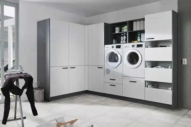Hauswirtschaftsraum-Set. Pflegeleichte Fronten. Soft-Close-Funktion. Made in Germany. Inklusive 3 Wäschekörbe