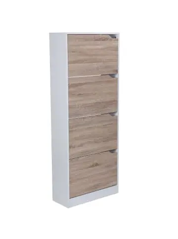 Artikelnummer: FB45015 EAN: 4250950264267PflegehinweiseDie Oberfläche mit einem lauwarm angefeuchteten Baumwolltuch reinigen; Keine Scheuermittel, scharfe Reinigungsmittel oder tropfnasse Tücher verwendenDesign• Schuhschrank mit 4 Fächern zum Aufklappen • Praktische und integrierte Griffe an jedem Fach • Modernes Design in Weiß mit einer Front in Sonoma EicheAbmessungen• Breite: ca. 60 cm • Höhe: ca. 150 cm • Tiefe: ca. 24 cmInnenabmessungen• Breite: 46 cm • Höhe: ca 34,5 cm • Tiefe: 11,5 / 8,5 cm • Weitere Abmessungen: Siehe DetailbildFarbe• Gestell: Weiß • Front: Sonoma EicheBesonderheiten• Kippfächer mit praktischem Scharnier und integriertem Stopp • Pro Regal passen ca. 6 Paar Schuhe mit Schuhgröße 38 – Dies kann je nach Form der Schuhe abweichen • Für freistehende Platzierung in Wandnähe vorgesehen – Rückseite des Regals offenMaterial• SpanplatteLieferumfang• 1 Schuhschrank • Lieferung ohne DekorationMontage• Lieferzustand: Praktisch zerlegt und verpackt • Montageanleitung inklusive