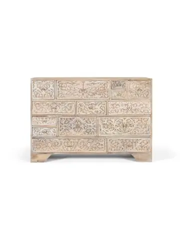 Handgefertigte Kommode aus Massivholz mit attraktiven Schubladen in verschiedenen Größen. Jede Schublade verfügt über eine handgeschnitzte Front mit filigranen Blumenmotiven. Das robuste, rechteckige Design mit erhöhtem Sockel auf kurzen, schrägen Beinen sorgt für Stabilität und optische Leichtigkeit. Die dezenten Metallgriffe fügen sich harmonisch in die Schnitzerei ein, ohne die dekorative Gesamtästhetik zu beeinträchtigen. Beinhöhe: 8 cm, Deckel: 1,8 cm Wood