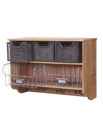 – Markeninhaber TÜV-Süd QM zertifiziert mit Nr. 12 100 59626 TMS für Qualitäts-Management in Deutschland – Lieferumfang: 1x Wandgarderobe ohne Dekoration – Shabby-Look – 3 Haken – 3 kleine und 2 große Schubladen – Material Gestell: Tannenholz und MDF – Material Haken und Schubladen: Metall – Befestigungsmaterial nicht im Lieferumfang enthaltenMaße HxBxT (ca.):Gesamtmaße: 42x60x24 cmInnenmaße der kleinen Schubladen: 12x16x13 cmInnenmaße der großen Schubladen: 14×25,5×20 cm Möbel in Patchwork-Optik sind nicht im Trend, sie werden gerade erst dazu. Schwimmen Sie nicht mit dem Strom, sondern seien Sie die ersten, die diesen unvermeidbaren Trend für sich entdecken. Der leicht verspielte Shabby Look wird durch die Kombination aus Holz und Metall zu Patchwork – erstaunlich, dass es diese Kombination erst jetzt, zumindest als Geheimtipp, in die Design-Blogs dieser Welt geschafft hat. Sie wünschen von einer Wand mehr als nur Ihr Haus zusammen zu halten? Mit dieser Wandgarderobe können Sie jede Wand praktisch und dekorativ aufwerten! Die gebürstete Oberfläche verleiht jedem einzelnen unserer Shabby-Patchwork-Produkte einen ganz eigenen, individuellen Used-Look. Bei der Verarbeitung kann es zu kleinen Kratzern oder Macken kommen.Versandzustand: Teilmontiert–Sicherheitshinweise für Teilartikel mit Artikelnummer 64318 Dieser Artikel ist eine Standgarderobe und sollte nur als solche verwendet werden. Der Artikel ist nur für den Innenbereich geeignet. Überladen Sie den Artikel nicht. Vorsicht Erstickungsgefahr! Verpackungsmaterial, wie Plastikbeutel, gehören nicht in Kinderhände. Bitte von Babys und Kleinkindern fernhalten! Nicht über den Kopf ziehen! Vorsicht: Verschluckungsgefahr! Achtung dieser Artikel kann verschluckbare Kleinteile enthalten! Halten Sie die Kleinteile von Kindern fern! Prüfen Sie den Artikel regelmäßig alle 3-6 Monate auf Beschädigungen und gelöste Verbindungen. Ziehen Sie lose Schrauben wieder fest an! Sollten Beschädigungen entdeckt werden, darf der Artikel nicht mehr genutzt werden! Warnung: Kippgefahr, Unfallgefahr und Verletzungsgefahr!Ein Möbelstück, das nicht an der Wand befestigt wird, kann wenn es umfällt ein Kind oder einen Erwachsenen schwerwiegend oder sogar tödlich verletzen. Befestigen Sie daher alle Möbel mit Winkeln oder speziellen Kippschutzen (teilweise nicht im Lieferumfang enthalten) an der Wand. Achten Sie dabei immer auf mögliche Kabel oder Rohre die in der Wand verlegt sein können.Benutzen Sie diesen Artikel nur für die bestimmungsgemäße Verwendung, im technisch einwandfreien Zustand und für private Zwecke. Andere Verwendungen gelten als nicht bestimmungsgemäß und können zu schweren Verletzungen und Beschädigungen führen. Für aus bestimmungswidriger Verwendung entstandene Schäden übernimmt der Hersteller keine Haftung.Allgemeine Hinweise: Bitte lesen Sie alle Hinweise sorgfältig durch, bevor Sie den Artikel aufbauen und verwenden. Verwahren Sie die alle Sicherheitsinformationen und Aufbauanleitungen gut auf. Für Ihre eigene Sicherheit und die Ihres Produktes, befolgen Sie bitte die Sicherheitshinweise. Eine falsche Handhabung könnte zu ernsten Verletzungen, beschädigtem Eigentum oder sogar dem Tod hinauslaufen.Pflegehinweise: Verwenden Sie eine weiche Bürste um losen Schmutz zu entfernen. Benutzen Sie niemals Waschmittel oder andere Putzmittel, um den Bezug zu reinigen. Entsorgungshinweise: Entsorgen Sie den Artikel umweltgerecht. Überlegen Sie Alternativen zu Entsorgung wie Spenden oder Verkaufen. Elektrische Artikel gehören nicht in den Hausmüll. Entsorgen Sie diese an einem Recyclinghof für elektrische und elektronische Altgeräte, weitere Informationen erhalten Sie bei Ihrer örtlichen Gemeindeverwaltung. Einlagerungshinweise: Der Artikel sollte trocken und sauber sein, verwahren Sie diesen geschützt in dem Karton in dem er geliefert wurde.