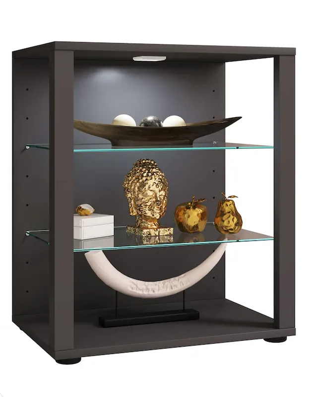 Highlights:- Zwei Einlagenböden aus Glas- Fachböden individuell verstellbar- Offene Vitrine- Vitrine ohne Glasfronten – Beleuchtung optional erhältlich- Maße H. 60 x B. 52 x T. 35 cmBei der offenen Sammelvitrine „Glasol S“ hat der Designer Funktion und Optik wunderschön miteinander vereint. Zwei schmale Traversen sorgen für eine besondere Optik der Sammelvitrine. Die Fachböden aus Glas sind verstellbar und passen sich somit zu jederzeit den persönlichen Bedürfnissen an. Die Vitrine kann mit der LED-Beleuchtung „VCM Leuchto“ ergänzt werden.VCM hat sich seit den 70er-Jahren auf die Konstruktion, Produktion und Vertrieb von Möbeln mit einem fairen Preis/Leistungsverhältnis spezialisiert und damit bereits Millionen Haushalte verschönert.