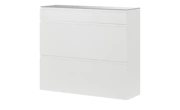 Mit einem Schuhschrank lässt sich im Flur im Handumdrehen Ordnung schaffen. Deshalb empfehlen wir Ihnen den Schuhschrank Nicolo. Er ist mit einer Schublade und zwei Klappen ausgestattet. Hinter den Klappen befinden sich insgesamt vier Fächer. Die beiden Einlegeböden können Sie in der Höhe variieren, um die Größe der Fächer individuell anzupassen. Die Schublade ist mit einer Soft-Close-Funktion ausgestattet, die beiden Klappen verfügen über einen Klappendämpfer. Soft-Close und Dämpfer sorgen für leises Schließen. Nicolo hat ein reduziertes, puristisches Design in mattem Weiß. Die Abdeckplatte oben wird zusätzlich von einem Glas mit Anti-Fingerabdruck-Oberfläche ergänzt.