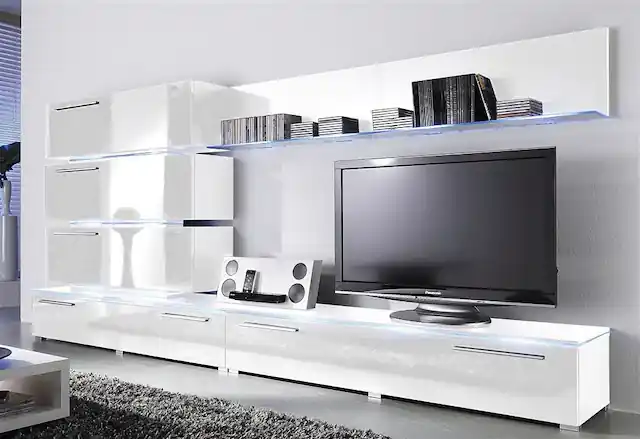 Set besteht aus 3 Hängeschränken, 2 Glasbodenpaneelen und 2 TV-Lowboards. Hochglänzende Fronten und Schubkästen auf Metallschienen bieten eine moderne Optik und Funktionalität. Schubladen und Klappen bieten praktischen Stauraum für Medien und Zubehör. Optionale LED-Beleuchtung für Glasbodenpaneele setzt Ihre Einrichtung gekonnt in Szene. Wählen Sie aus den Farben Schwarz, Weiß oder Grau, um Ihr Wohnzimmer individuell zu gestalten