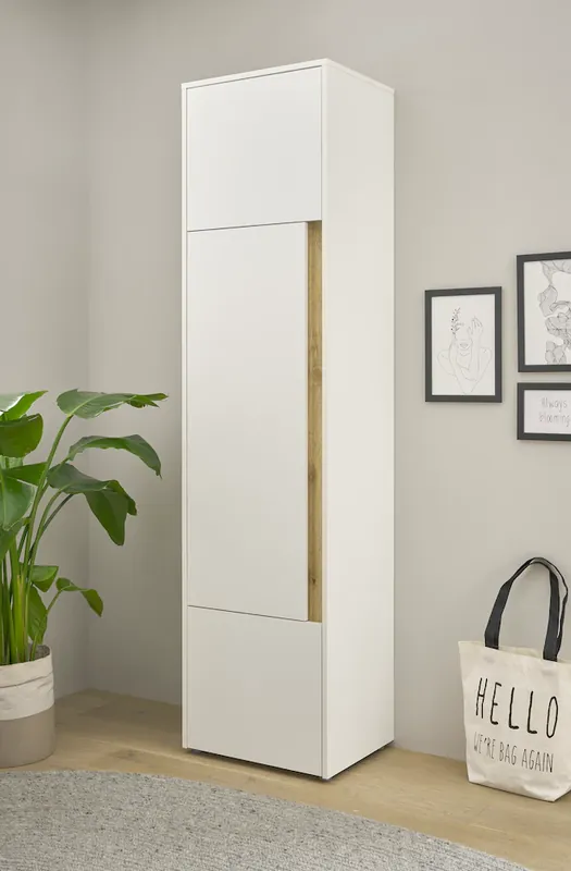 Maße: B50 x T40 x H200 cm. Modernes Design, das sich vielseitig kombinieren lässt.. 3 Drehtüren und 4 variabel einsetzbare Einlegeböden für flexiblen Stauraum.. Melaminbeschichtung macht die Oberfläche langlebig, kratzfest & pflegeleicht.. FSC®-zertifiziert: Verantwortungsvoll