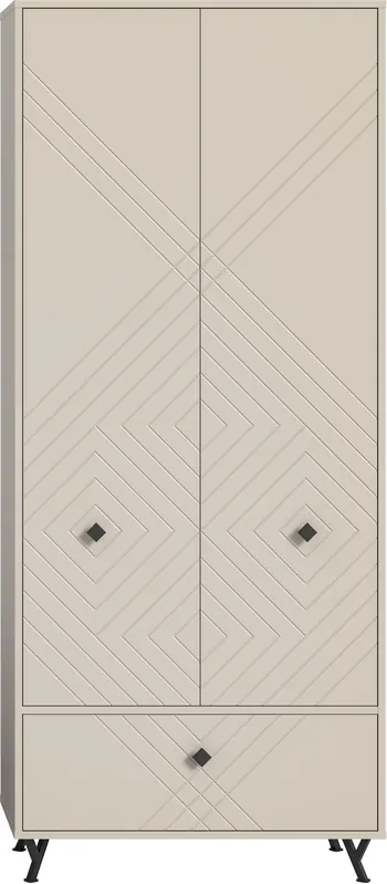 Maße ca. (B/T/H): 80/35/195 cm. 2 Türen, 3 höhenverstellbare Einlegeböden, 2 feste Böden, 6 Fächer, 1 Klappe. hochwertige verarbeitete Ornamentfräsung in den MDF Fronten. schwarze Metall Knopfgriffe und Y-Füße. Das Möbel besteht aus FSC®-zertifiziertem Holzwerkstoff zum Schutz der Wälder