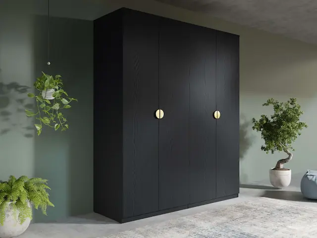 Home Affaire – Luxuriöses, zeitgenössisches Wohnen. Die perfekte Kombination aus Eleganz, Funktionalität und modernem Design.. Die Möbel zeichnen sich durch eine minimalistische Form, klare Linien und hohe Verarbeitungsqualität aus, was dem Raum Charakter und Langlebigkeit verleiht.. Der Kleiderschrank ist mit goldenen Metallgriffen, zwei Kleiderstangen und vier Einlegeböden ausgestattet, was die Organisation erleichtert.. Die sichtbaren Strukturlinien auf der Dekoroberfläche in Schwarzgrau verleihen dem Schrank einen besonderen Charme.