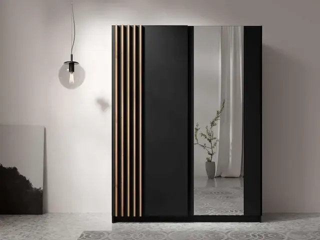 Home Affaire – Innovation & Design in jedem Einrichtungsstück. Die Kombination aus klassischem Schwarz mit Artisan-Eiche schafft eine wunderbare Farbzusammenstellung, die sich von anderen Farben abhebt.. Schiebetüren ermöglichen die Gestaltung sowohl enger Flure als auch größerer Räume.. Der Schrank bietet viel Stauraum und verleiht jedem Raum gleichzeitig ein modisches Design.. Die Lamellen wurden aus widerstandsfähigem MDF hergestellt.