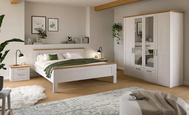 Maße der Einzeltypen (B/H/T): Bettgestell: 189x90x209 cm, Nachtschrank je 56x43x39 cm, Kleiderschrank 188x200x61 cm. 4-teiliges Set, bestehend aus: 1x Bettgestell, 2x Nachtschrank, 1 Kleiderschrank. Schlichtes, modernes Schlafzimmer-Set im Landhaus-Look mit farblich abgesetztem Oberboden, sowie Kopf- & Fußteil. Große Typenvielfalt, individuell erweiterbar durch weitere Artikel der Serie COSENZA. Das Möbel Set besteht aus FSC®-zertifiziertem Holzwerkstoff zum Schutz der Wälder