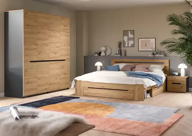 Maße der Einzeltypen (B/H/T): Nachtkommoden – 2er-Set je 50x42x37 cm, Bett 180×200 – 184x87x205 cm. 4-teiliges Set, bestehend aus: 1x Nachtkommoden – 2er-Set, 1x Bett 180×200. Große Typenvielfalt, individuell erweiterbar durch weitere Artikel der Serie. Schnelle und einfache Montage, Pflegeleichte Oberfläche. Das Möbel Set besteht aus FSC®-zertifiziertem Holzwerkstoff zum Schutz der Wälder
