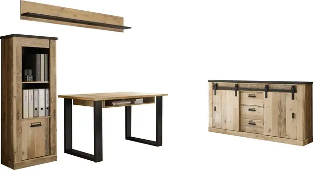 Home affaire – Die Premium-Linie der Marke Home affaire. In modernem Holz Dekor mit Scheunentorbeschlag und Apothekergriffen aus Metall.. Passend zu weiteren Möbelstücken der Serie SHERWOOD. Einfache Selbstmontage. Pflegeleichte Oberfläche