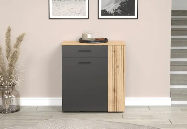 Dank seiner Maße von 80 cm Breite, 36 cm Tiefe und 88 cm Höhe findet der Schuhschrank leicht Platz und bietet Dir dennoch praktischen Stauraum. Ideal zur Aufbewahrung von Schuhen, Accessoires und Alltagsgegenständen, damit Dein Eingangsbereich stets ordentlich bleibt. Robuster Holzwerkstoff in Kombination mit einer langlebigen Melaminoberfläche verleiht dem Möbelstück Stabilität, Pflegeleichtigkeit und Widerstandskraft. Zwei Türen, ein Schubkasten mit Vollauszug, ein Einlegeboden und ein Konstruktionsboden schaffen eine flexible Innenaufteilung und sorgen für Übersicht. Die beiliegende Anleitung ermöglicht eine einfache Montage, und die pflegeleichte Oberfläche erleichtert Dir die Reinigung im Alltag