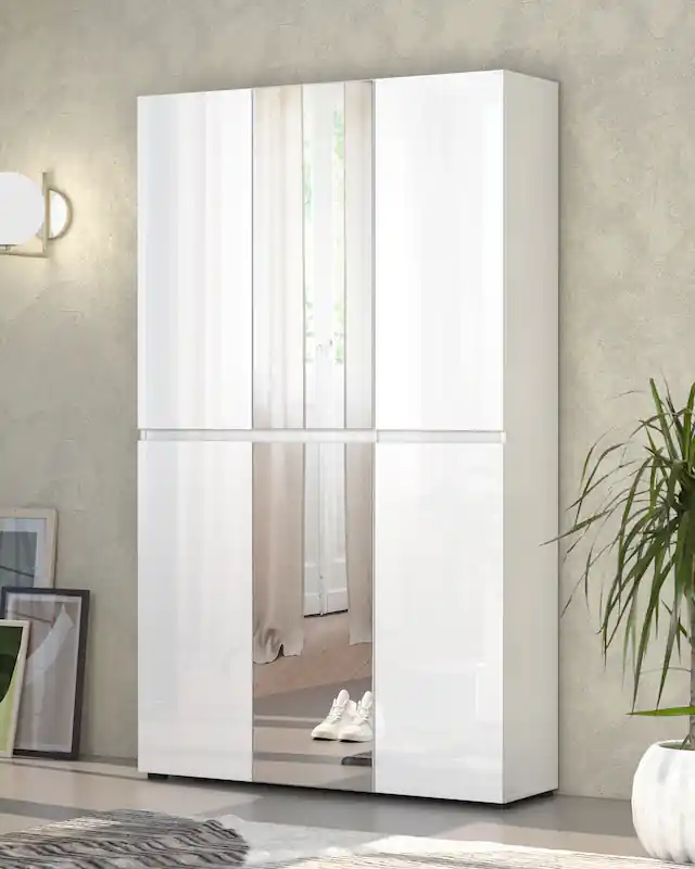 Maximaler Stauraum: Breite 120 cm, Höhe 200 cm – mit 24 geräumigen Fächern für all Ihre Schuhe und Accessoires.. Spiegelelemente: Zwei integrierte Spiegel bieten Funktionalität und vergrößern optisch den Raum – ideal für den letzten Style-Check.. Hochglanz lackierter Schuhschrank. Mit 6 Türen bietet der Schrank eine einfache Organisation und schnellen Zugriff auf alle Fächer.. Kompakte Tiefe: Nur 34 cm tief – passt perfekt in schmale Räume und bietet dennoch viel Stauraum.. Italienische Qualität: 100% Made in Italy