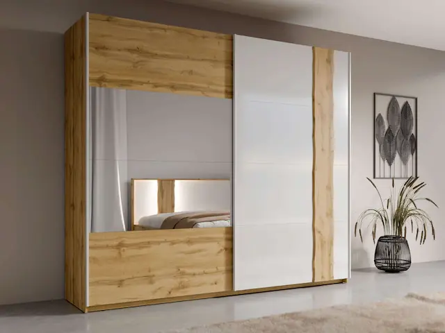 Der perfekte Wäscheschrank: Dein »Fabella« bietet 8 Böden & 2 Kleiderstangen. So hast du deine Wäsche & Garderobe flexibel organisiert!. Schwebetürenschrank »Fabella«: Platzsparend durch Schiebetüren & integrierten Spiegel. Vergrößere optisch jeden Raum – dein cleveres Ordnungswunder.. Dein Schlafzimmerschrank »Fabella«: Hochglanz-Design im Landhausstil mit Wotan- und Artisan-Eiche. Eleganz, die sich perfekt kombinieren lässt!. Robuster Kleiderschrank »Fabella«: Dank kratzfestem Melamin, ABS-Kanten und robusten Alugriffen ist er extrem langlebig und widerstandsfähig. Top-Qualität!. Vielseitiger Garderobenschrank »Fabella« für mehr Ordnung in jedem Zimmer. Als Teil der »Fabella«-Serie findest du weitere passende Schlafzimmermöbel.
