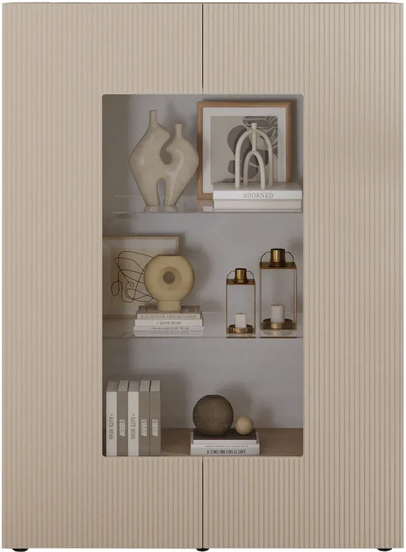 ELEGANT & AKZENTREICH: Die Vitrine mit geriffelter MDF-Front und Glaseinsatz präsentiert Ihre Lieblingsstücke stilvoll und setzt Akzente in Ihrem Raum.. VIELSEITIG & GERÄUMIG: Mit 2 Türen und 5 Innenfächern bietet die Standvitrine clevere Stauraumlösungen – ideal als stilvolle Ergänzung für verschiedenste Einrichtungskonzepte.. STABIL & FORMSCHÖN: Die Glasvitrine bietet 2 Holzböden (je bis 5 kg) und 2 Glasböden (je bis 3 kg). Metallbeschläge sichern Langlebigkeit, grifflose Front für moderne Optik.. ITALIENISCH & FSC: Die Stauraumvitrine in 2 Farben vereint italienisches Design mit Holzwerkstoff aus FSC®-zertifizierter Quelle.. ZEITLOS & LANGLEBIG: Das grifflose Möbelstück mit melaminbeschichteter Oberfläche bietet dauerhafte Wertigkeit und ein elegantes Erscheinungsbild in einem.