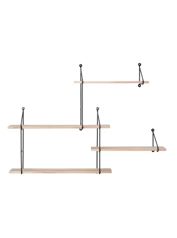 Holzregal Harlem von House Nordic Stufenförmiges ReagalMit 4 Regalböden aus HolzStabile MetallaufhängungGröße: ca. 99 x 62 cm Produktbeschreibung An Funktionalität und Schlichtheit kaum zu übertreffen integriert sich das schicke House Nordic Wandregal Harlem ideal in den zeitgemäß puristischen Wohnstil. In Schwarz und Hellbraun passt das attraktive House Nordic Regal sowohl zu hellen, wie auch zu dunklen Möbeln hervorragend. Gleichzeitig zieht der spannende Gegensatz des dunklen, kühlen Metalls zum hellen, warmen Holz die Blicke auf sich, sodass sich Deine Deko-Accessoires auf dem smarten House Nordic Wandregal optimal präsentieren lassen. Auf vier Ebenen, die versetzt zueinander angebracht sind, kannst Du extravagante Kerzenhalter, kleine Zimmerpflanzen und hübsche Keramikfiguren in Szene setzen. Hängst Du das ausgefallene House Nordic Regal an die Küchenwand, lassen sich verzierte Vorratsgläser oder urige Teedosen ins Rampenlicht stellen. Und im Schlafzimmer finden Omas alter Wecker und Vaters erstes Kofferradio in dem stylishen House Nordic Wandregal eine würdevolle Bühne. Produktinformation Artikelnummer: 69.429-1085 Material: Metall, Holz Abmessungen:Breite ca. 99 cm, Höhe ca. 62 cm, Tiefe ca. 17 cmGewicht: Ca. 0 kg Lieferumfang: 1 House Nordic Wandregal Harlem 99×62 cm Dekorationsartikel gehören nicht zum Leistungsumfang