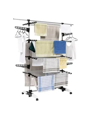 – Material: Kunststoff, Edelstahl – 6 Rollen für einfaches Verschieben – 4 abnehmbare Kleiderbügelhalter – 48 Haken speziell für Dessous‘ – 8 Maxi-Tabletts zum Aufhängen – Oberrohr auf beiden Seiten ausziehbar – Clips zur Höhenverstellung der Tabletts – platzsparend mit klappbaren FüßenHinweis: Dekoration ist nicht im Lieferumfang enthalten.