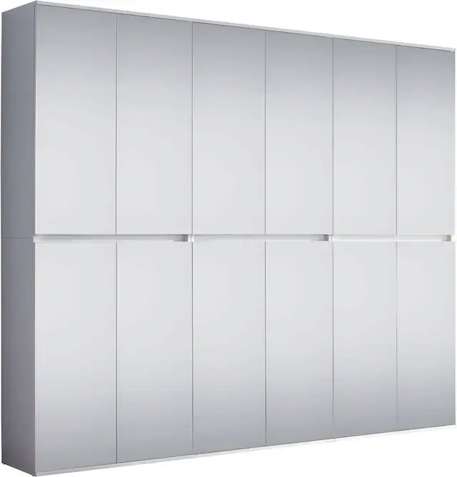 Mehrzweckschrank-Set bestehend aus 3 Einzelschänken, Breite jeweils 74 cm. Alle 12 Türen mit Spiegelfront. Inneneinteilung: jeweils 1 Kleiderstange, 1 fester Boden und 6 Einlegeböden. Gesamtstellfäche (B/T/H): 222/34/191 cm. Die Schänke können zusammen oder getrennt voneinander gestellt werden.. Bietet viel Stauraum
