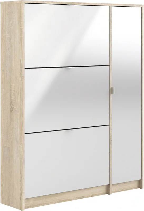 Moderne Schuhschrank mit Metallgriffen. Mit 3 Klappen und jeweils 2 Böden sowie 1 Tür mit Einlegeboden, viel Stauraum. FSC®-zertifizierter Holzwerkstoff. Hochwertige und stabile Innenböden aus Metall. Made in Denmark