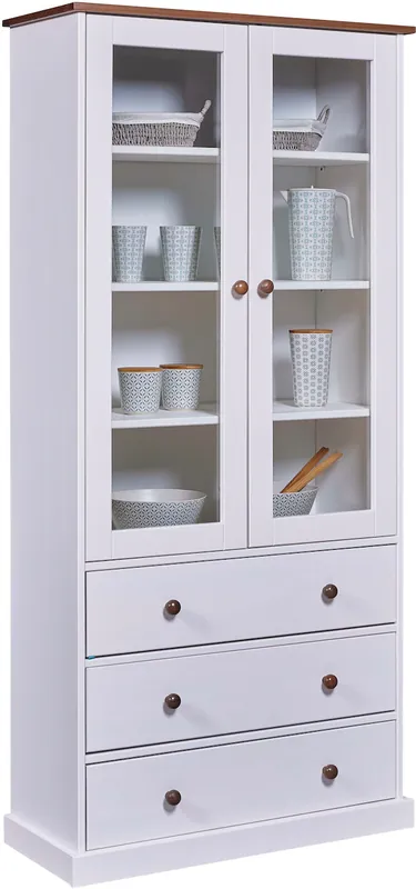 Die Vitrine besteht aus massivem Weihrauchkiefer und ist lackiert. Die Maserung ist noch sichtbar und hebt so den natürlichen Charakter des Holzes hervor.. Die Landhaus Vitrine verfügt über 3 Schubladen und 3 Einlegeböden hinter 2 Türen, so dass Sie Geschirr ordentlich und elegant aufbewahren können.. Die sepiafarbene Abdeckplatte verleiht der praktische Vitrine seinen zeitlosen Landhausstil. Das Buffet ist wasserabweisend und pflegeleicht.. Einfache Montage: Das Produkt wird mit einer bebilderten, anschaulichen Montageanleitung geliefert, sodass der Aufbau zum Kinderspiel wird.. Aufgebaute Maße BxTxH ca.: 90 x 38,10 x 190 cm