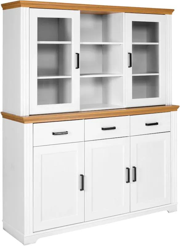 Massives Kiefernholz – 56 mm starkes, robustes Profil sorgt für Langlebigkeit, Stabilität und hochwertige Verarbeitung.. Zeitloses Farbdesign – Weiß mit Eiche Colori Lackierung, bei der die natürliche Holzmaserung dezent sichtbar bleibt, für eine warme und elegante Optik.. Vielseitiger Stauraum – Schubladen und Türen mit Softclose bieten großzügigen Platz für Geschirr, Accessoires oder Alltagsgegenstände.. Komfortable Handhabung – Softclose-Funktion bei Türen und Schubladen sorgt für geräuschloses, sanftes Schließen.. Edle Details – Metallgriffe und dekorative Hohlkehlfräsungen verleihen dem Buffet einen stilvollen, modernen Charakter.