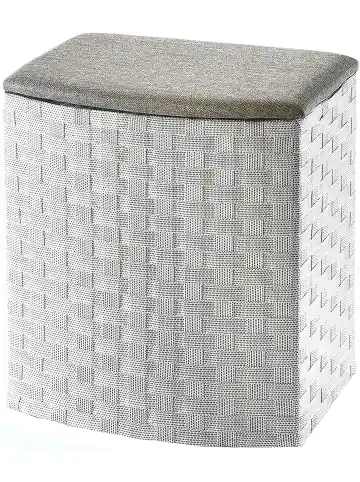 Wäschebehälter von Kobolo. Oberflächendeko aus Nylon geflochten. Ausgeschlagen mit Textilfutter (100% Baumwolle), ein Blickfang für jedes Bad in weiß grau. Dieser Wäschebehälter wird in Handarbeit gefertigt. Das Fassungsvermögen beträgt c.a. 56 Liter.