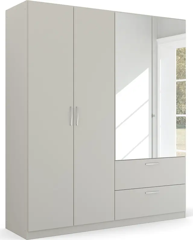 Überzeugt mit minimalistischem Design in dezenten Farben fÜr wohnliche Raumatmosphäre mit vollflächig aufgelegten SpiegeltÜren. Mit geräumigen Schubladen für zusätzlichen Stauraum. Passende, geschwungene Metallgriffe in Alufarben runden das Design gekonnt ab. Fachböden und Kleiderstangen können individuell eingesetzt und in der Höhe verstellt werden. 100% Made in Germany, ausgezeichnet mit dem Blauen Engel und dem Goldenen M