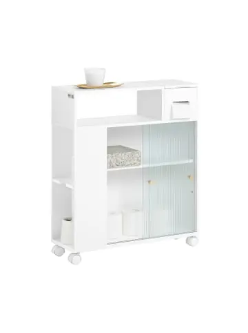 Ein offenes Fach und Zwei Schiebetüren aus Glas bieten eine Menge Stauraum für Ihre Gewürze, Badeutensilien, usw. Toilettenbürsten und Papierhandtücher haben eine eigene Aufbewahrung. Ideal für jede Lücke und Nische bis 20 cm breite. Mit den 4 drehbaren Rollen entscheiden Sie, ob der Wagen mobil oder standfest ist.Gewicht: ca.13,3kg; Belastbarkeit: bis 45kg; Material: MDF(E1), Glas.