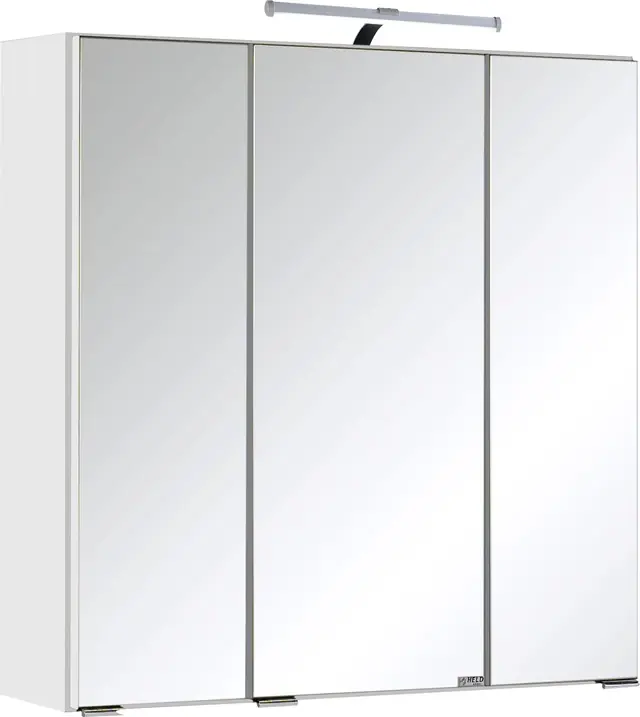 3D-Effekt, dank drei Spiegeltüren. Inklusive schwarzer LED-Aufbauleuchten. Verstellbare Glasböden. Viel Stauraum für Handtücher und Pflegeprodukte. Ordnung im Bad. #Stauraum #Organisation. Made in Germany – Dieses Produkt ist in Deutschland gefertigt und besticht durch seine hochwertige Verarbeitung, die eine solide und langlebige Nutzung gewährleistet.
