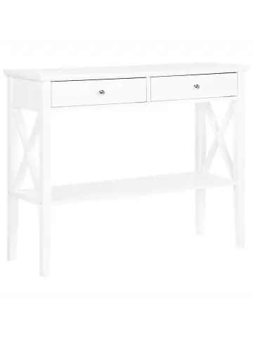 Stilvolle Konsole mit zwei Schubladen. Ein elegantes Möbelstück, das sich vor allem für den Eingangsbereich oder das Wohnzimmer eignet – perfekt um kleine Gegenstände, wie z.B. Schlüssel oder Ihre Lesebrille abzulegen. Auch Dekoartikel und Tischlampen präsentieren sich besonders schön auf dieser Kommode und schaffen dabei ein gemütliches Ambiente im Raum. Die klassische weiße Farbe der Konsole macht sie zur idealen Ergänzung für jeden Einrichtungsstil.Details: Typ: Konsolentisch Stil: Minimalistisch Farbe: Weiß Material: MDF-Platte Material Rand: Holzwerkstoff Gestellmaterial: Holzwerkstoff Tischplattenmaterial: Holzwerkstoff Schubladen: Ja Finish: Gefärbt Schubladen: 2 Regalböden: JaDimensions: Tiefe: 35 cm Breite: 100 cm Höhe: 80 cm Gewicht: 21 kg Max. Belastung der Schublade: 5 kg Max. Belastung pro Fach: 10 kg Max. Belastung der Oberplatte: 10 kgSie kaufen: 1x KonsolentischProduktvorteile: Leicht zugängliches, offenes Regal, Praktisches Regal, Zeitloses Design, Hochwertiges Material, Multifunktional, Zusätzlicher StauraumMontage: Nicht montiert. 20 – 40 Min.Zusatzinformationen: Um die Haltbarkeit und die Ästhetik der Arbeitsplatte zu erhalten, sollte man Platzsets und Untersetzer verwenden und feuchte Stellen schnellstmöglich trocken wischen, um Produktschäden zu vermeiden.Pflegeanleitung:MDF-Platte: 1.Bitte ausschließlich milde Reinigungsmittel und weiche Tücher verwenden. Feuchte Stellen sofort trocken reiben.