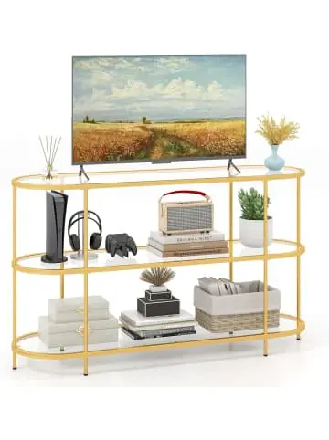 Beschreibung: Genießen Sie ein großartiges Fernseherlebnis mit dem eleganten 55” TV-Ständer, der Fernseher bis zu 65’’ aufnehmen kann. Dieser Medientisch hat eine breite Tischplatte und 2 Aufbewahrungsregale, die Ihre Essentials organisiert halten. Der robuste Metallrahmen sorgt für zuverlässige Unterstützung für Ihre Elektronik und enthält verstellbare Fußpolster für Stabilität auf jeder Oberfläche und besseren Schutz des Bodens. Das Premium-gehärtete Glas verleiht dem Tisch einen modernen Touch und ist pflegeleicht, mit Anti-Rutsch-Pads für zusätzliche Stabilität. Perfekt für Wohnzimmer, Flur oder Arbeitszimmer, passt dieses Entertainment-Center nahtlos in jeden Raum und bietet sowohl Funktionalität als auch Stil.Eigenschaften: Viel Platz für Fernseher verschiedener Größen, einschließlich 40”, 55” oder 65” 3-stöckige Aufbewahrungseinheit mit breiter Tischplatte und 2 geräumigen Regalen Premium gehärtetes Glas mit Anti-Rutsch-Pads für Stabilität Sprühmetallstruktur, die robust und langlebig ist Verstellbare Fußpolster passen sich unebenem Boden an und sorgen für optimale Stabilität Elegante und funktionale Wahl für Wohnzimmer, Schlafzimmer, Arbeitszimmer Funktioniert als TV-Schrank oder Ausstellungsregal, je nach Vorliebe Material: Metall, gehärtetes Glas Gesamtmaße: 140 x 41 x 82 cm (L x B x H) Maße jedes Regals: 136 x 37 cm (L x B) Höhe der Bodenfreiheit: 34 cm Höhe über dem Boden: 9 cm Gewichtskapazität der Tischplatte: 75 kg Gewichtskapazität jedes Regals: 30 kg Netto-Gewicht: 23,5 kgLieferungsumfang: 1 x TV-Schrank 1 x Benutzerhandbuch