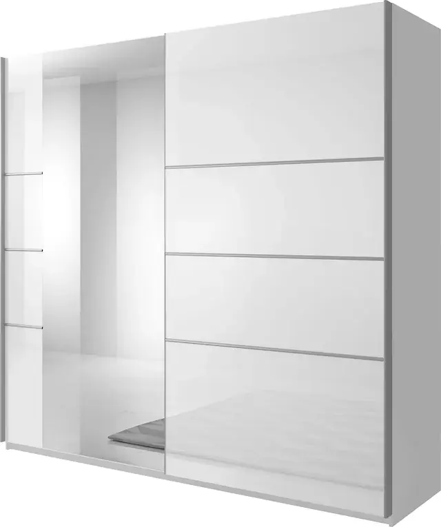 Der Schwebetürenschrank aus hochwertigem FSC-zertifiziertem Holzwerkstoff vereint stilvolles Design mit Funktionalität.. Hochglanz verleiht dem Raum eine gewisse Tiefenwirkungdurch die Reflexion des Lichtes und lässt dadurchRäume größer wirken; zusätzlich wirkt es edel und schick.. Beschläge, Scharniere und Kleiderstangen aus Metall. Organisierte Aufbewahrung, viel Stauraum, trendige Farben. Made in Europe