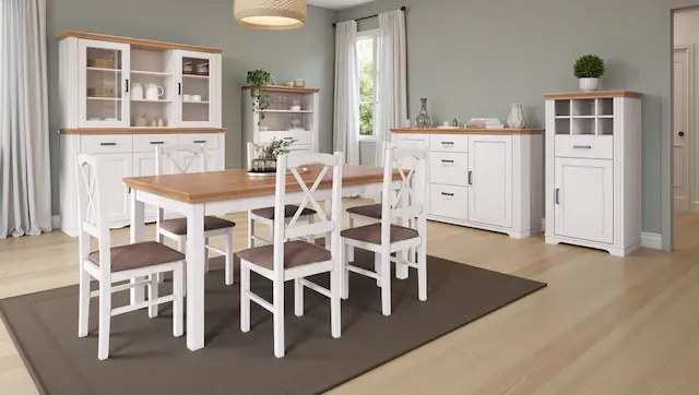 Perfekter Aufsatz zu den Maluno Sideboards, kombiniert weiße und Eichefarben-Lackierung mit leicht sichtbarer Holzmaserung für einen modernen, natürlichen Look.. Gefertigt aus massivem Kiefernholz für langlebige Stabilität und natürliche Eleganz.. Zwei Türen mit Sicherheitsglas, jeweils zwei Einlegeböden, plus drei offene Fächer für dekorative Objekte oder Alltagsgegenstände.. oftclose-Türen für sanftes, geräuschloses Schließen; elegante schwarze Metallgriffe runden das Design ab.. Ideal für die stilvolle Präsentation von Geschirr, Dekoration oder Sammlerstücken dank offener und geschlossener Bereiche.