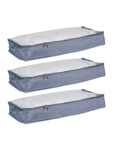 Die flachen Unterbettkommoden sind perfekt, um Kleidung, Decken, Bettzeug und mehr bequem unter dem Bett oder auf dem Schrank zu verstauen. Der robuste Reißverschluss sorgt für bequemen Zugriff und schützt den Inhalt effektiv vor Staub. Durch das transparente Sichtfenster an der Oberseite kannst Du stets erkennen, was sich im Inneren der Bettkastenorganizer befindet. Mit diesen platzsparenden Verstautaschen schaffst Du Ordnung im Schlafzimmer und nutzt den vorhandenen Platz optimal aus.Unterbettkommode 3er Set im Detail – Maße H x B x T: ca. 14 x 100 x 45 cm – Gewicht: je Box ca. 190 g – Material: Polyester, PP, PE – Farbe: Grau, TransparentDeckenaufbewahrung zum Verstauen unter dem Bett – Aufbewahrung von Kleidung, Decken, Bettzeug uvm. – Nutze ungenutzten Platz unterm Bett optimal aus – Sichtfenster für einfache Identifizierung des Inhalts – Doppelseitiger Reißverschluss für bequemen Zugriff – Unterbettboxen bieten effektiven Schutz vor Staub – Bei Nichtgebrauch einfach zusammenfaltenLieferumfang – 3x Unterbettaufbewahrungsbox – Dekoartikel sind nicht im Lieferumfang enthalten
