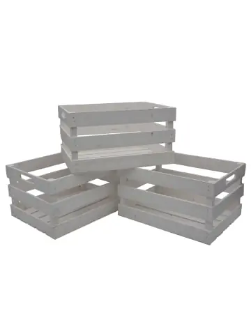 Holzkiste Vintage 3er Set 39x29x21 cm weißDas stilvolle Design der Holzkisten bringt Vintage Flair in Ihr Zuhause und verschönert jeden Raum. Die Holzkisten sind vielseitig einsetzbar, egal ob als Dekoration, zur Aufbewahrung, zum Transportieren oder als kleines Möbelstück. Dekorieren Sie die Holzkiste mit weiteren Dekoelementen oder verwandeln Sie diese in ein praktisches Regal oder einen Beistelltisch. Sie sind auf der Suche nach einer kreativen Geschenkidee? Diese Weinkisten eignen sich nicht nur als Geschenk selbst, sondern auch als Geschenkkiste in dem Sie Kleinigkeiten schön präsentieren können. Überraschen Sie damit Ihre Freunde, Familie und Bekannte!ProduktdetailsMaterial: – Holz Details: – 3er Set Holzkisten Verwendung: – Dekokiste oder Aufbewahrungskiste Abmessungen: – Maße: 39 x 29 x 21 cm (LxBxH)