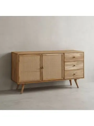 DesignSideboard in zeitlosem LookIndividuelle Maserung und Farbgestaltung machen jede Kommode einzigartigGetragen wir das robuste Möbelstück von vier stabilen StandbeinenGroße Ablage, Türfächer und Schubladen für mehr Stauraum und OrdnungAbmessungenBreite: 140 cmHöhe: 75 cmTiefe: 40 cmBodenfreiheit: 20 cmMaterialstärke der Ablage: 1,5 cmAblagefläche (BxT): 80 x 40 cmWeitere Abmessungen finden Sie im MaßbildFarbeKorpus: BraunGriffe: GoldBesonderheitenDrei Schubladen, zwei Türfächer und große Ablagefläche für maximalen StauraumDas Sideboard wurde in liebevoller Handarbeit gefertigt und ist somit ein absolutes UnikatDie Oberflächen der Kommode sind durch eine Klarlackbeschichtung geschütztMaterialKorpus: Mango MassivholzTürfronten: SchilfrohrgeflechtGriffe: lackiertes EisenLieferumfangEin Sideboard ohne DekorationMontageanleitung und -material liegen der Lieferung beiMontageLieferzustand: teilmontiert – lediglich die Beine müssen angebracht werdenPflegehinweiseDie Oberfläche mit einem lauwarm angefeuchteten Baumwolltuch reinigen. Keine Scheuermittel, scharfe Reinigungsmittel oder tropfnasse Tücher verwenden.