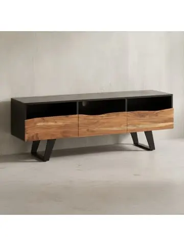DesignTV-Unterschrank in modernem DesignAusdrucksstarke und natürliche HolzmaserungTüren und Schublade mit BaumkanteRechteckige Ablagefläche bietet viel Platz für Deinen FernseherAbmessungenBreite: 140 cmHöhe: 50 cmTiefe: 40 cmInnenmaße je Türfach und offenem Ablagefach (BxHxT): 45 x 12 x 36 cmInnenmaße der Schublade (BxHxT): 39 x 9 x 34 cmMaterialstärke: 1,5 cmBodenfreiheit: 21 cmFarbeKorpus und Beine: SchwarzTüren und Schublade: warmes DunkelbraunBesonderheitenDie Fernsehkommode ist ideal für TV-Geräte mit bis zu 65 Zoll (auch für größere Fernseher geeignet, bitte Beinabstand des TV-Geräts beachten)Jede Anrichte wurde in Handarbeit gefertigt und ist daher ein absolutes UnikatHolzschutz bietet die Schutzlackversiegelung der HolzoberflächenEin Fach mit Kabeldurchlass für Spielekonsolen und ReveiverZwei Türfächer, zwei offene Fächer und eine Schublade eignen sich ideal für Konsolenspiele und DVDsVerschlüsse an den Türen verhindern, dass sich diese nicht ungewollt öffnenAnti-Rutsch-Noppen an den Beinen schützen Deinen Fußboden und das Metall vor unschönen KratzernEmpfohlene Maximalbelastbarkeit: 50 kgMaterialKorpus: Akazie Massivholz, schwarz lackiert und zusätzlich mit Klarlack beschichtetSchub- und Türfronten: Akazie Massivholz, zusätzlich mit Klarlack beschichtetRückwand: MDFBeine: pulverbeschichtetes EisenLieferumfangEin Lowboard ohne DekorationMontageanleitung und -material inklusiveMontageLieferzustand: teilmontiert, lediglich die Beine müssen angebracht werdenPflegehinweiseDie Oberfläche mit einem lauwarm angefeuchteten Baumwolltuch reinigen. Keine Scheuermittel, scharfe Reinigungsmittel oder tropfnasse Tücher verwenden.