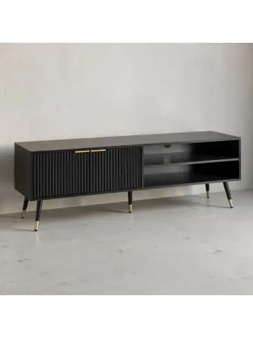 DesignTV-Unterschrank in modernem DesignTürfronten in eleganter LamellenoptikRechteckige Ablagefläche bietet viel Platz für Deinen FernseherAbmessungenBreite: 150 cmHöhe: 51 cmTiefe: 39 cmInnenmaße je offenem Ablagefach (BxHxT): 73 x 13 x 37 cmInnenmaße je Türfach (BxHxT): 36 x 28 x 35,5 cmBodenfreiheit: 20 cmMaterialstärke: 1,5 cmWeitere Abmessungen findest Du im MaßbildFarbeKorpus: SchwarzBeine: Schwarz / GoldGriffe: KupferfarbenBesonderheitenDie Fernsehkommode ist bis zu einer TV Größe von 70 Zoll geeignetBeide Türfächer eignen sich ideal für Konsolenspiele und DVDsZwei offene Ablagefächer für Spielekonsolen und ReceiverEin Kabeldurchlass, der oben oder unten montiert werden kannAnti-Rutsch-Noppen schützen Deinen Fußboden und das Metall vor unschönen KratzernEmpfohlene Maximalbelastbarkeit: 35 kgMaterialLowboard: folierte Spanplatte in schwarzer Eiche-OptikBeine und Griffe: pulverbeschichtetes EisenLieferumfangEin Lowboard ohne DekorationMontageanleitung und -material inklusiveMontageLieferzustand: demontiert und sicher verpacktPflegehinweiseDie Oberfläche mit einem lauwarm angefeuchteten Baumwolltuch reinigen. Keine Scheuermittel, scharfe Reinigungsmittel oder tropfnasse Tücher verwenden.