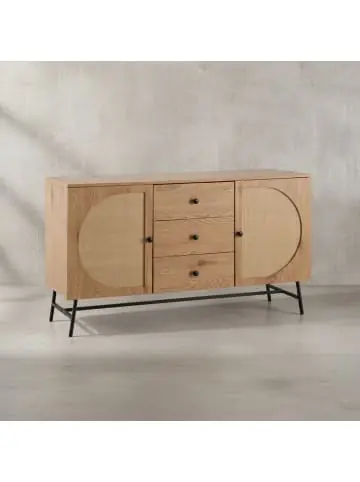 DesignStilvolles Sideboard in modernem DesignOberflächen mit ansprechendem Eiche-DekorTürfronten mit auffälligem GeflechtVier stabile Standbeine tragen den KorpusAbmessungenBreite: 140 cmHöhe: 80 cmTiefe: 40 cmInnenabmessungen je Türfach (BxHxT): 44 x 29 x 38 cmInnenabmessungen Schublade (BxHxT): 40 x 16 x 29 cmBodenfreiheit: ca. 17,5 cmMaterialstärke: 1,5 cmFarbeKorpus: BraunBeine und Griffe: SchwarzBesonderheitenInsgesamt drei Schubladen und vier Türfächer bieten Dir viel StauraumZwei Einlegeböden lassen sich jeweils auf drei verschiedenen Höhen verstellenAnti-Rutsch-Noppen schützen den Fußboden und das Metall vor unschönen KratzernAufgrund des Designs kann das Sideboard in vielen Räumen eingesetzt werden (z.B. Küche, Wohnzimmer…)Empfohlene Maximalbelastbarkeit: 30 kgMaterialKorpus: folierte Spanplatte in EichenoptikGriffe und Gestell: pulverbeschichtetes EisenGeflecht: PolyrattanLieferumfangEin Sideboard ohne DekorationMontageanleitung und -material liegen der Lieferung beiMontageLieferzustand: demontiert und sicher verpacktPflegehinweiseDie Oberfläche mit einem lauwarm angefeuchteten Baumwolltuch reinigen. Keine Scheuermittel, scharfe Reinigungsmittel oder tropfnasse Tücher verwenden.