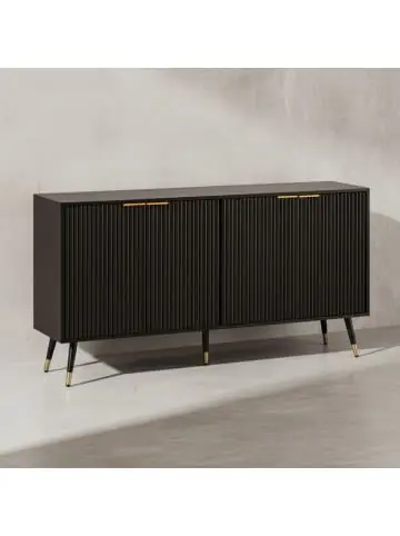 DesignStilvolle Kommode in modernem DesignTürfronten in eleganter LamellenoptikFünf stabile Standbeine tragen den KorpusAbmessungenBreite: 150 cmHöhe: 81 cmTiefe: 39 cmInnenabmessungen je Türfach (BxHxT): 35,5 x 28,5 x 35 cmBodenfreiheit: 19,5 cmMaterialstärke: ca. 1,5 cmWeitere Abmessungen findest Du im MaßbildFarbeKorpus: SchwarzBeine: Schwarz / GoldGriffe: KupferfarbenBesonderheitenInsgesamt acht Türfächer mit festen verbauten Einlegeböden bieten Dir viel Stauraum für die unterschiedlichsten DingeObere Platte dient als großzügige Ablagefläche für z.B. DekorationAnti-Rutsch-Noppen schützen Deinen Fußboden und das Metall vor unschönen KratzernAufgrund des Designs kann das Sideboard in vielen Räumen eingesetzt werden (z.B. Küche, Wohnzimmer…)Empfohlene Maximalbelastbarkeit: 30 kgMaterialKorpus: folierte Spanplatte in schwarzer Eiche-OptikBeine und Griffe: pulverbeschichtetes EisenLieferumfangEin Sideboard ohne DekorationMontageanleitung und -material liegen der Lieferung beiMontageLieferzustand: demontiert und sicher verpacktPflegehinweiseDie Oberfläche mit einem lauwarm angefeuchteten Baumwolltuch reinigen. Keine Scheuermittel, scharfe Reinigungsmittel oder tropfnasse Tücher verwenden.